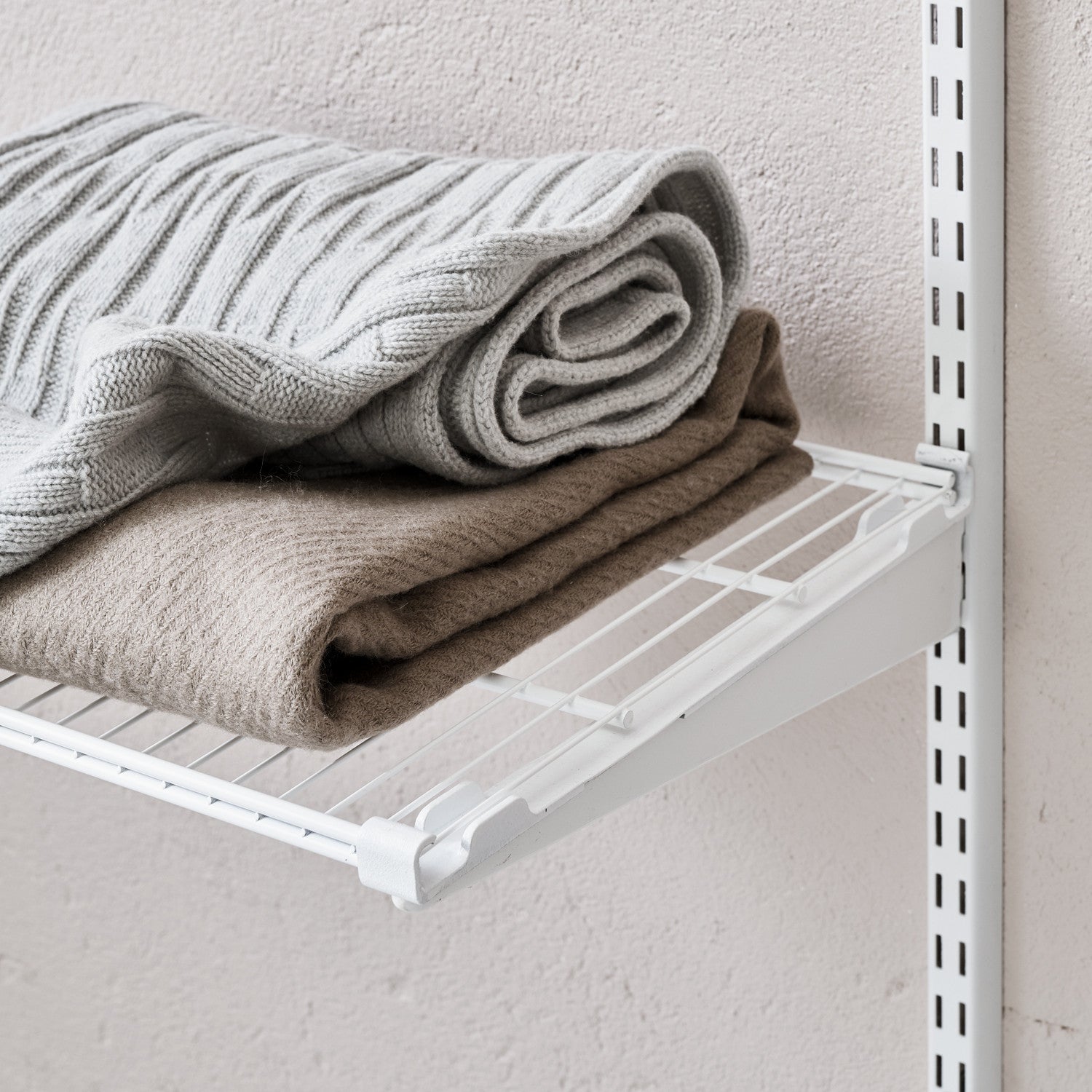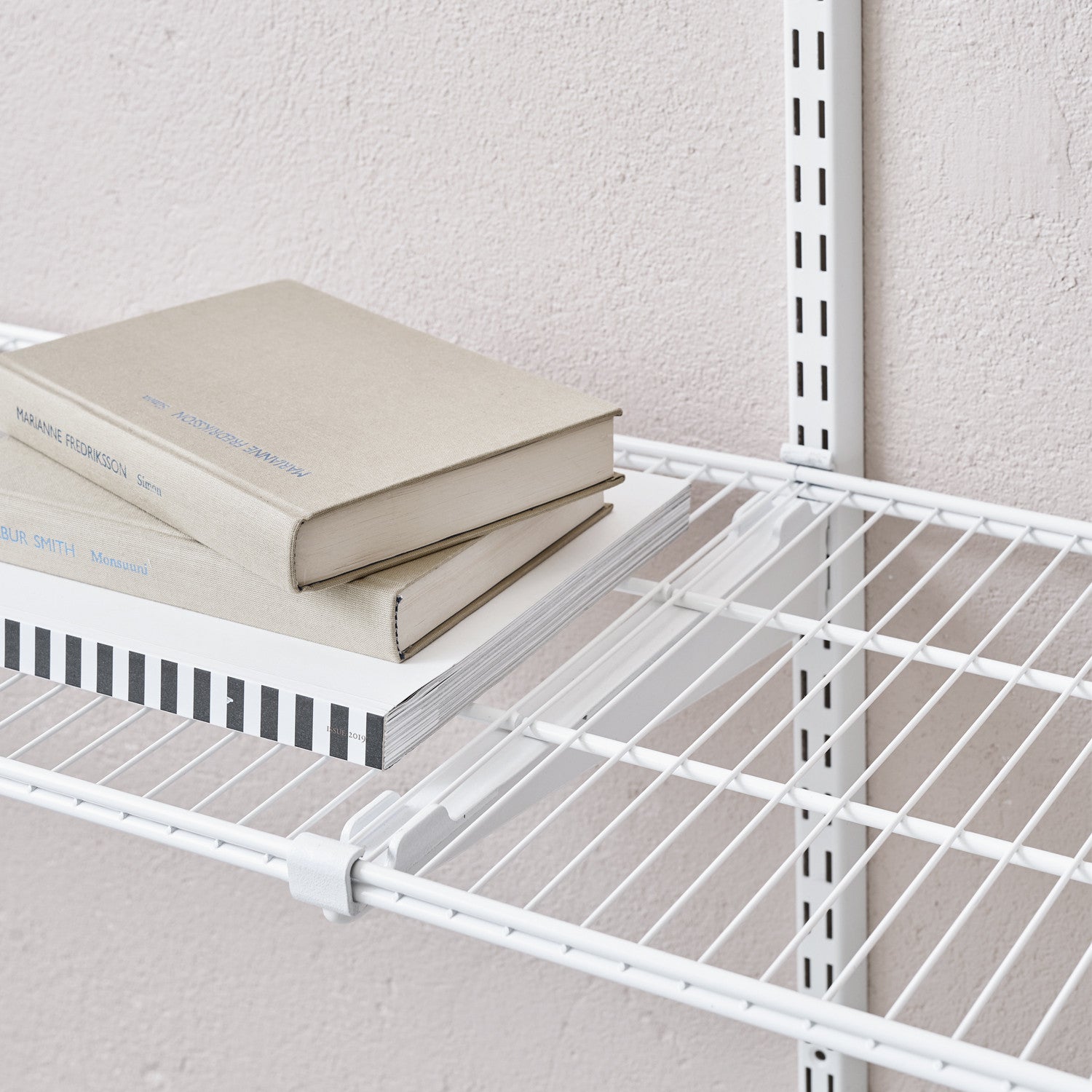 Lankahylly asennetaan hyllynkannattimeen asennuslistan avulla. Huomaathan, että asennuslista ja kannakkeet myydään erikseen. Yhden lankahyllyn asennukseen tarvitset 2 kpl asennuslistoja (asennettaessa lankahyllyjä vierekkäin, voidaan samaan asennuslistaan kiinnittää kaksi hyllyä).
