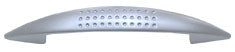 Kaarivedin, jossa pistemäisiä koristeita. Leveämpi keskikohta ja kapenee sivuille. Värinä matta kromi. Samaa vedinperhettä nuppivetimen HT659-21-000 kanssa.